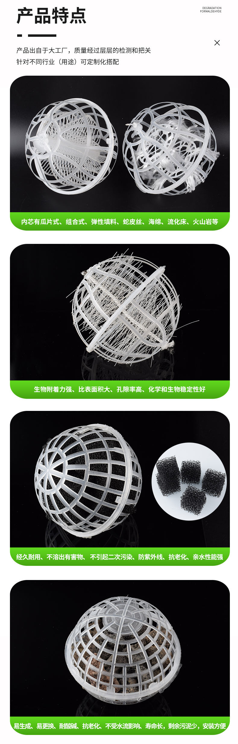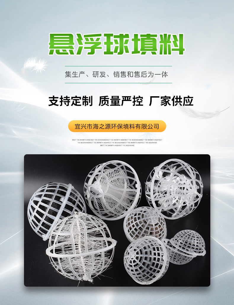 球形懸浮填料,又稱(chēng)多孔旋轉(zhuǎn)球形懸浮填料,是對(duì)國(guó)內(nèi)處理污水、生物膜法處理技術(shù)采用的多種填料中開(kāi)發(fā)的新系列產(chǎn)品。在污水的生化處理中具有全立體結(jié)構(gòu),比表面積大,直接投放,無(wú)須固定,易掛膜,不堵塞。