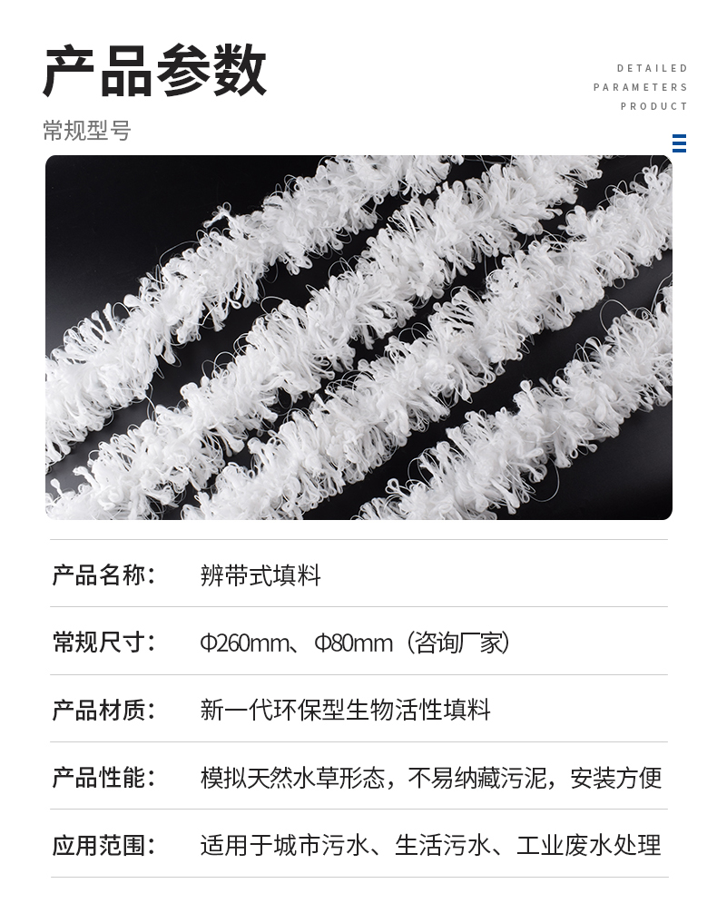 辮帶式水處理填料是新一代環保型生物活性填料,模擬天然水草形態,不易納藏污泥,充氧時管狀直徑具有可變性,無堵塞;具有親水、親油、對氣泡有很好的切割作用,有儲氧功能,吸附能力強;同時由于受水流和氣流的沖動