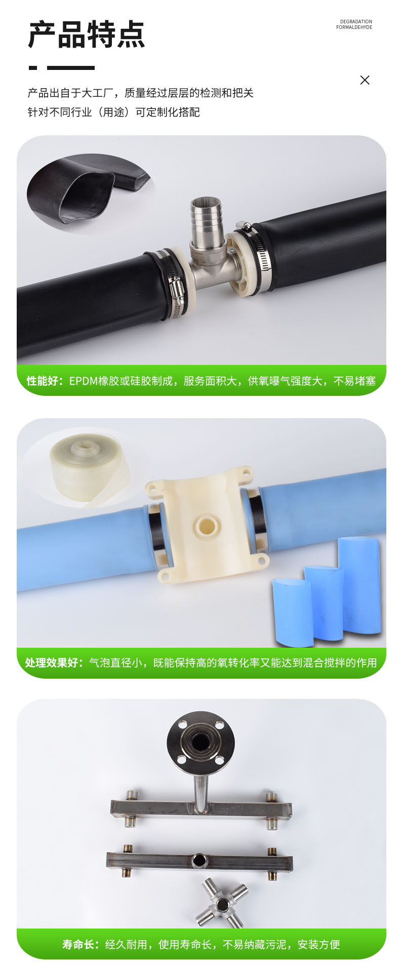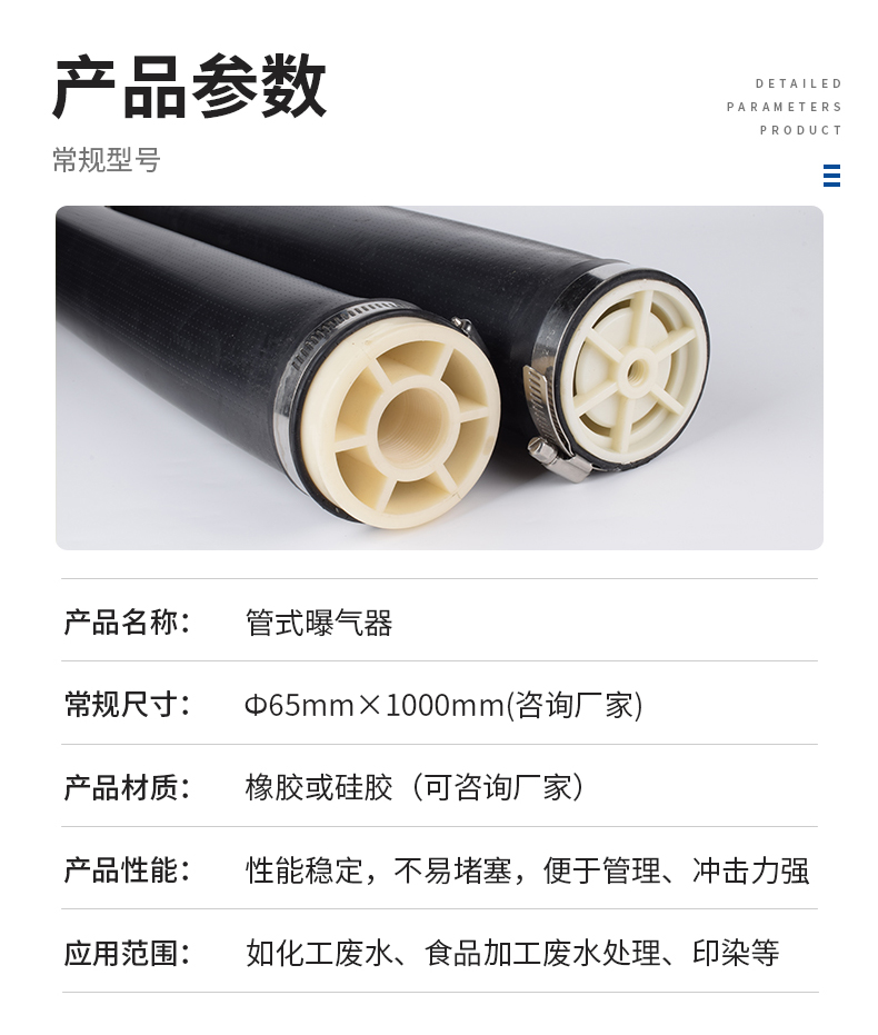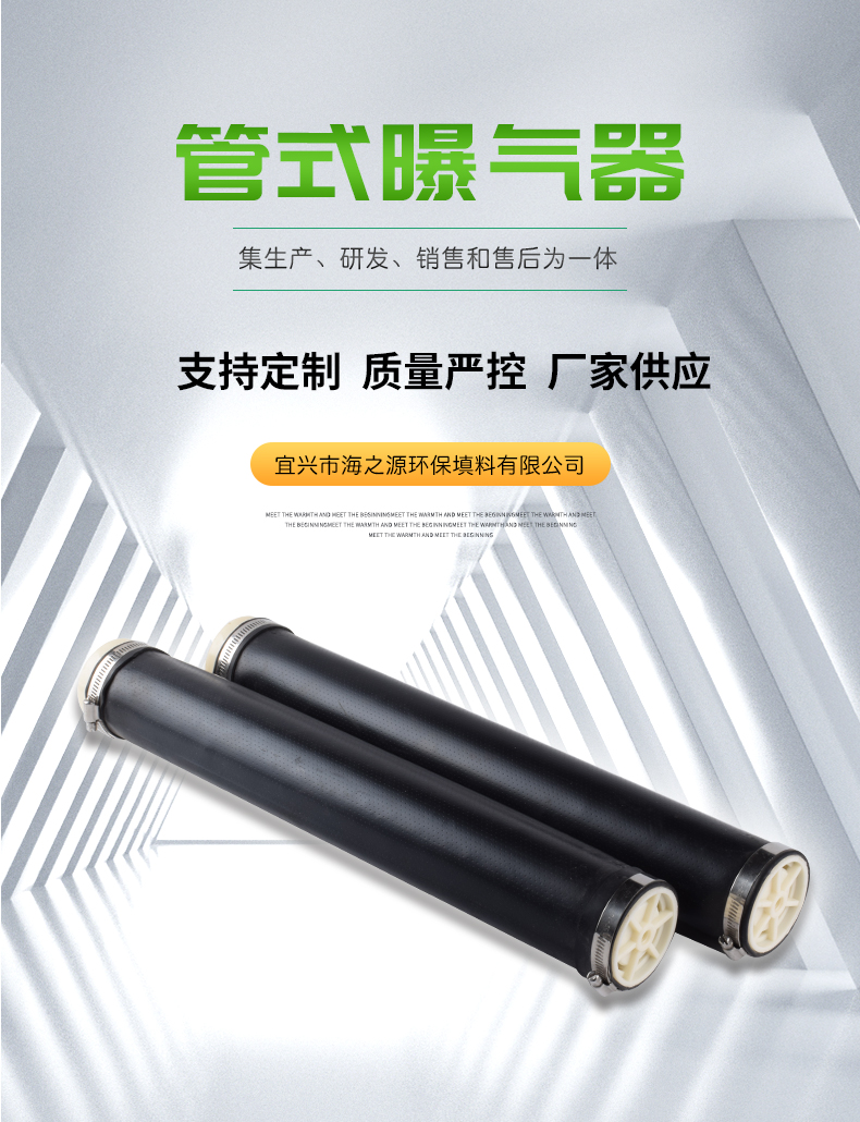管式曝氣器構(gòu)造:曝氣膜片、支撐管、空氣管道。管式曝氣器外徑69mm,常規(guī)為580mm、800mm和1000mm。長(zhǎng)度在580mm一下采用擠出或模壓成型,長(zhǎng)度大于580mm采用擠出成型。膜管上一1.5mm大小、2×2.5mm的間距打孔,能產(chǎn)生直徑1-3mm的均勻微小氣泡膜管頂部有15mm長(zhǎng)無(wú)氣孔區(qū),當(dāng)終斷供氣時(shí)膜片立即恢復(fù)原狀。對(duì)空氣入口起自動(dòng)防逆流作用。