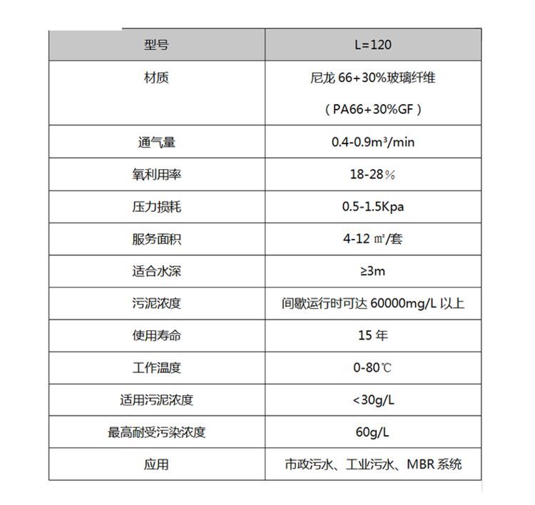 可升降旋流曝氣器整體由尼龍66+30%玻璃纖維制成,,具有較高的耐腐蝕性。其高度為42厘米,內徑為12厘米,進氣口中心距曝氣頭底部5厘米。