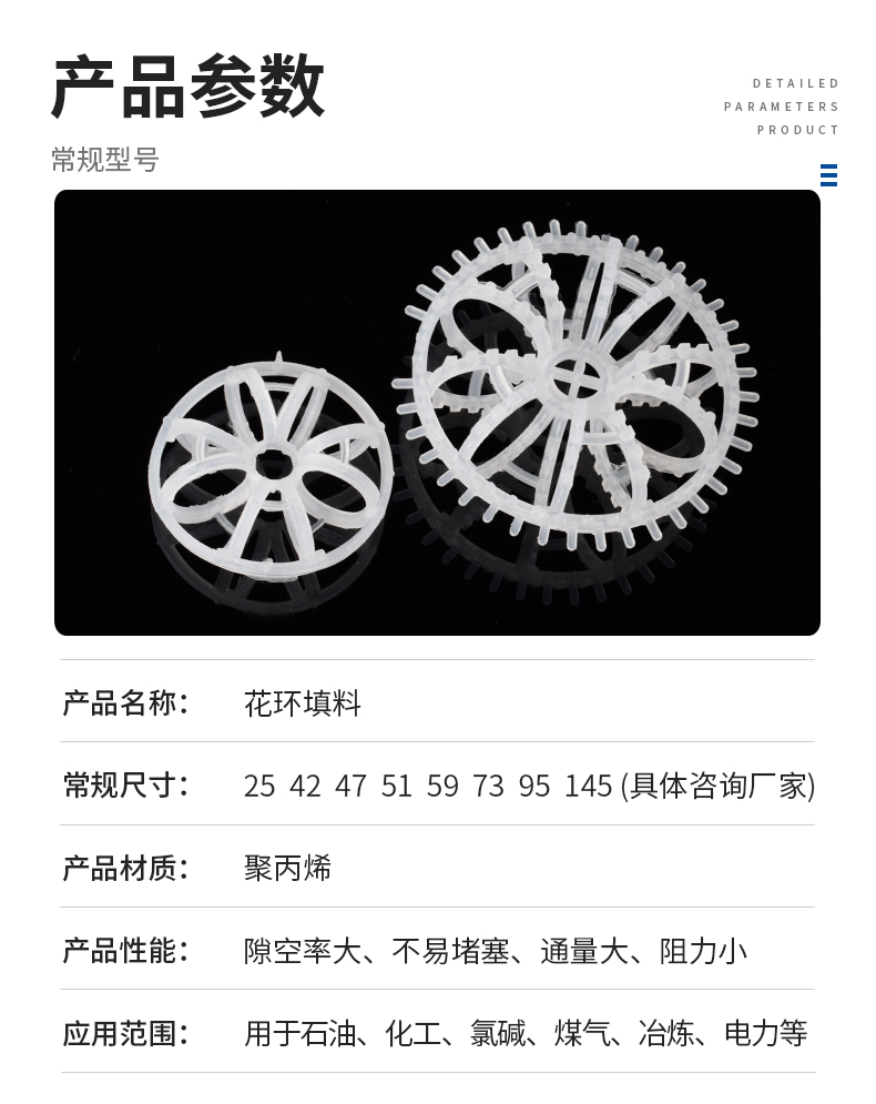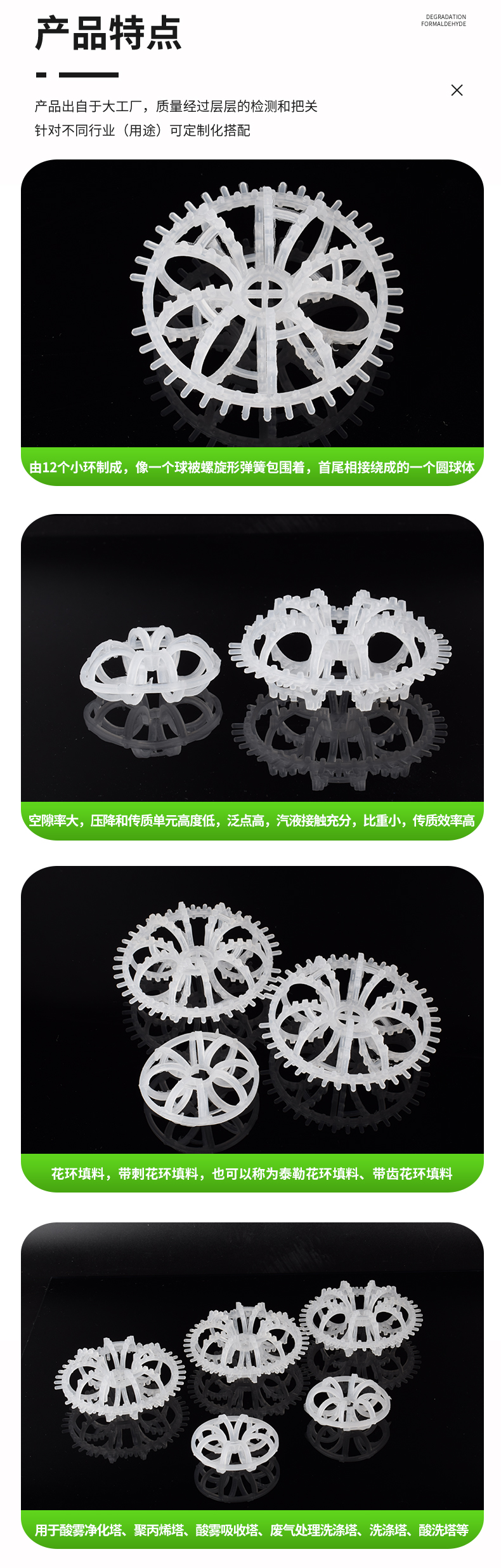 花環(huán)填料也稱梅花環(huán)填料是由許多圓環(huán)結(jié)繞而成,由于這種填料的間隙處能有較高的滯液量,可使塔內(nèi)液體停留時間較長,從而增加了氣液的接觸時間,提高了填料的傳質(zhì)效率。具有空隙率大,壓降和傳質(zhì)單元高度低,泛點(diǎn)高,汽液接觸充分,比重小,傳質(zhì)效率高等特點(diǎn),多用于氣體洗滌、凈化塔中。